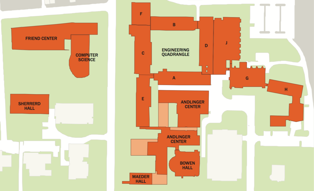 Don’t worry, you have lots of time to figure these things out. Freshmen engineers spend most of their classtime down-campus in and around Fine, Jadwin, and McDonnell Halls.